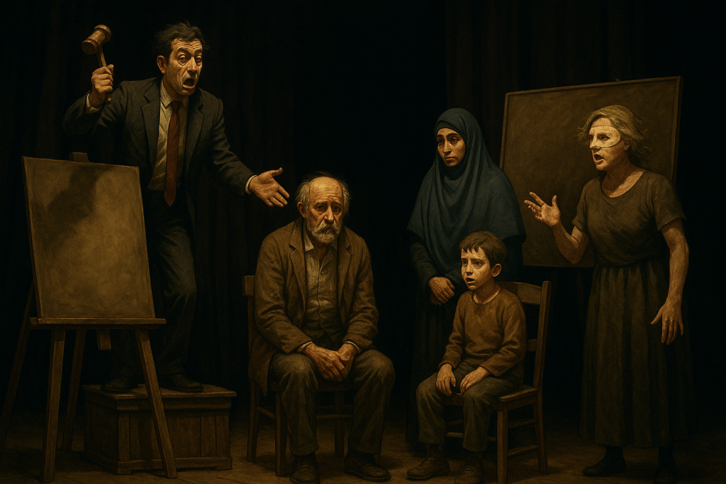 “كلما ازداد الزيف جمالًا، ازداد الواقع قبحًا” { جان جنيه} شخوص التجسيد:— 1. الحرية – بلباس ممزق، فاقدة الصوت، تتكلم بلغة الإشارات حتى الثلث الأخير. 2. الضمير – أعرج، يتحدث لغة موزونة فيها قافية وسخرية مرة. 3. الحقيقة – تتحدث دوماً بصيغ النفي، وكأنها لا تجرؤ على الجزم. 4. الوطن – كهل متسول، ينسى اسمه […]